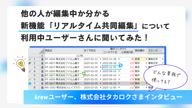 krewSheetが昨年リリースした「krewSheetリアルタイム共同編集」皆さん使っていますか? 事例インタビューにもご登場いただいた株式会社タカロクさまでは、以前からレコードの同時保存に悩まれていたそうで、本機能の設定・運用をいち早く進めていただきました。そこで、今回のブログでは、 […]